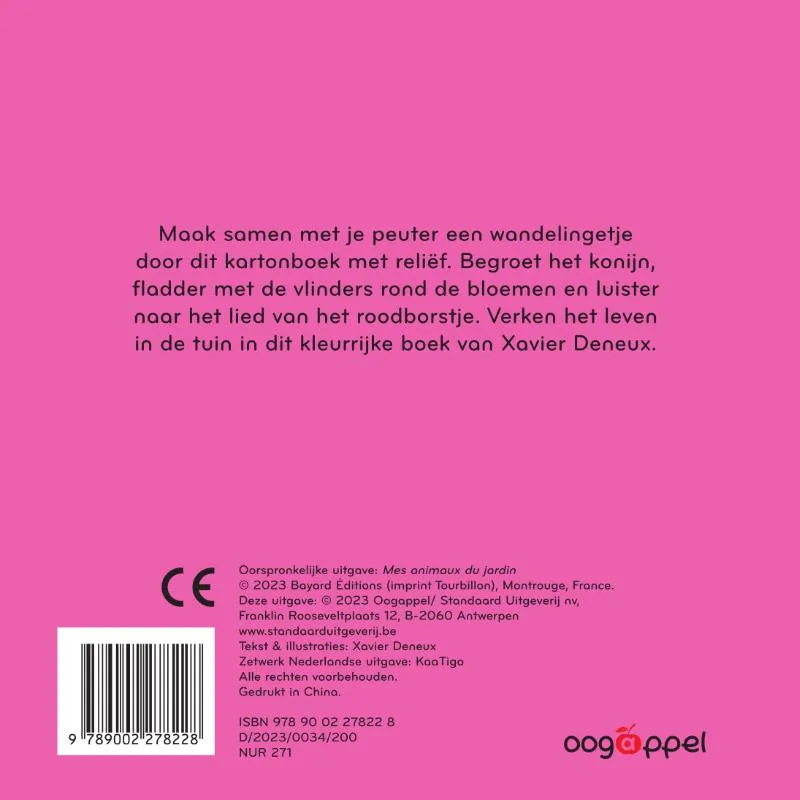 Maak samen met je peuter een wandelingetje door dit kartonboek met reliëf. Begroet het konijn, fladder met de vlinders rond de bloemen en luister naar het lied van het roodborstje. Verken het leven in de tuin in dit kleurrijke boek van Xavier Deneux.