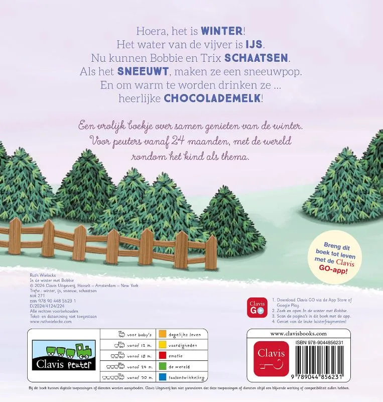 Hoera, het is WINTER! Het water van de vijver is IJS. Nu kunnen Bobbie en Trix SCHAATSEN! Als het SNEEUWT, maken ze een sneeuwpop. En om warm te worden drinken ze … heerlijke CHOCOLADEMELK. Een vrolijk boekje over samen genieten van de winter. Voor peuters vanaf 24 maanden, met de wereld rondom het kind als thema.