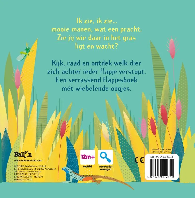 Ik zie, ik zie… mooie manen, wat een pracht. Zie jij wie daar in het gras ligt en wacht? Ik zie, ik zie…twee felle ogen in de donkere nacht. Zie jij wie daar achter de bladeren wacht? Deze twee flappenboeken staan niet alleen bol van verrassingen, maar bevatten ook twee wiebelogen die de beleving compleet maken. Hierdoor krijgt het klassieke spelletje ‘Ik zie, ik zie’ nog een extra dimensie. Het is aan het kind om te raden welk dier er door de flapjes komt piepen. De prachtige illustraties baden in een fris, aantrekkelijk kleurenpalet dat de beleving totaal zal maken.
