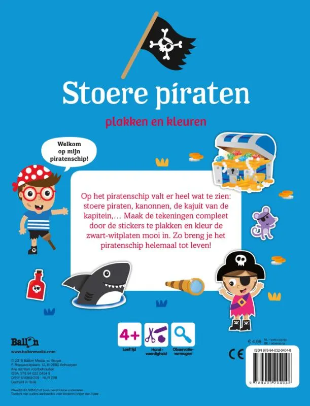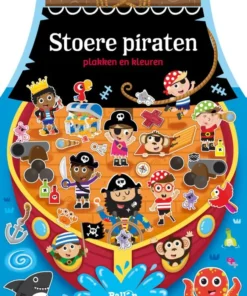 Op het piratenschip valt er heel wat te zien: stoere piraten, kanonnen, de kajuit van de kapitein, … Maak de tekeningen compleet door de stickers te plakken en kleur de zwart-witplaten mooi in. Zo breng je het piratenschip helemaal tot leven!