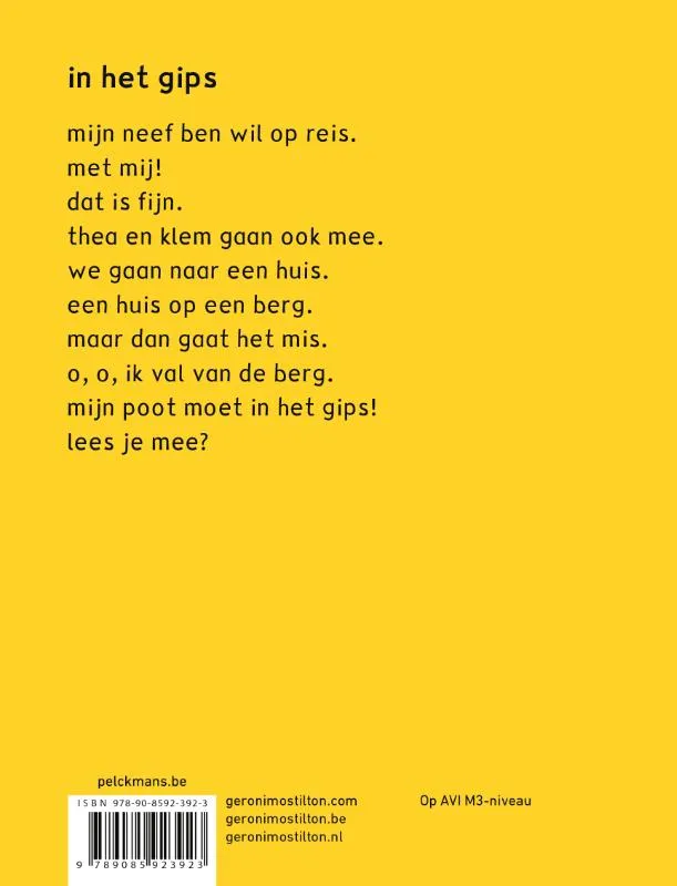 Neefje Ben wil graag op wintersport! Natuurlijk zegt oom Geronimo dan geen nee! Hij huurt een huis in de sneeuw, op een berg en de hele familie Stilton gaat mee. Wat een pret. Zelfs Geronimo stapt op de slee de berg af! Maar o jee, dan botst Dries Durfal tegen Geronimo op. Au! Geronimo belandt met een heleboel gebroken botten in het ziekenhuis. In het gips, zegt de dokter! Wat een gi-ga-pech! Of wordt het toch nog een leuke vakantie?