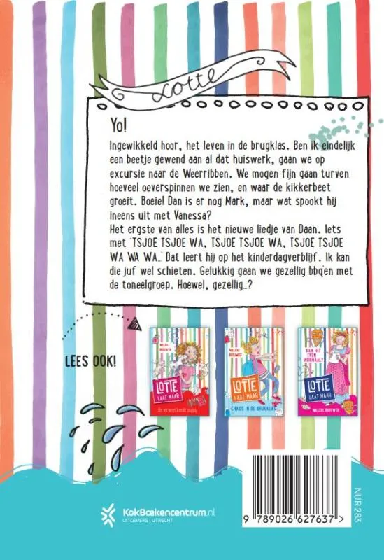 In vuur en vlam van Willeke Brouwer is het vierde en laatste deel uit de serie ‘Lotte laat maar’ voor kinderen vanaf 10 jaar. Lotte vindt het leven in de brugklas maar ingewikkeld. Is ze eindelijk een beetje gewend aan al dat huiswerk, gaan ze op excursie naar de Weerribben. Ze mogen fijn gaan turven hoeveel donkere waterjuffers ze zien, en waar de groenknolorchis groeit. Boeie! Dan is er nog Mark, maar wat spookt hij ineens uit met Vanessa? Het ergste van alles is het nieuwe liedje van Daan. Iets met ‘tsjoetsjoewa, tsjoetsjoewa, tsjoetsjoewaawaawaa…’ Dat leert haar broertje op het kinderdagverblijf. Lotte kan die juf wel schieten. Gelukkig gaat ze gezellig BBQ’en met de toneelgroep. Hoewel, gezellig…?
