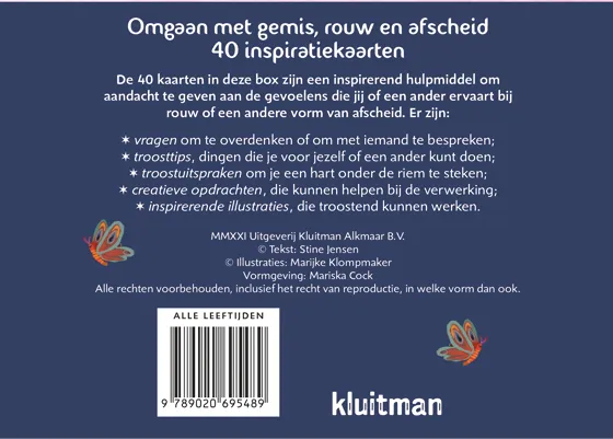 Afscheid nemen van een persoon, een situatie, een huisdier, een plek… Alle kinderen krijgen er een keer mee te maken, maar hoe ga je ermee om? Met deze inspirerende kaartenbox gaan ouder en kind samen aan de slag met deze moeilijke momenten. Aan de hand van vragen, opdrachten en troostende uitspraken is de box een fijne ondersteuning bij rouwverwerking en verlies, of een hulpmiddel om een gesprek over veranderingen mee op te starten. De inspiratiebox sluit goed aan bij het vorig jaar verschenen Alles wat was, maar je hebt het boek niet nodig om met de kaarten aan de slag te gaan.