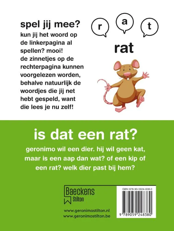 Nu kan degene met wie je dit boekje leest de zinnetjes op de rechterpagina voorlezen, behalve natuurlijk de woordjes die jij net hebt gespeld, want die lees je nu zelf! Dit deel gaat over dieren. Geronimo heeft al veel dieren ontmoet. Sommige vond hij lief en andere eng. Lees je mee?