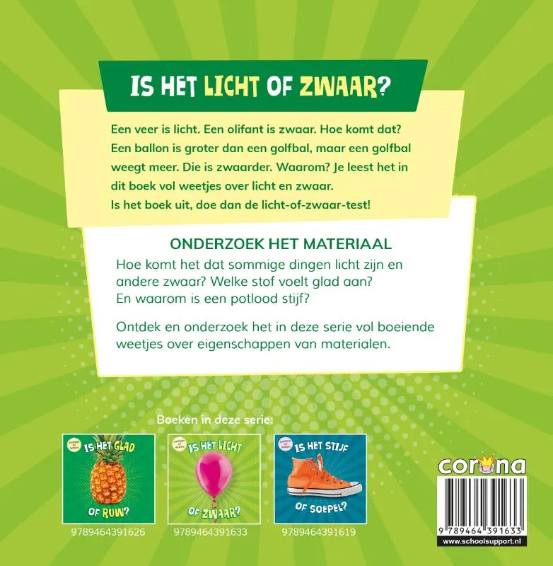 Een veer is licht. Een olifant is zwaar. Hoe komt dat? Een ballon is groter dan een golfbal, maar een golfbal weegt meer. Die is zwaarder. Waarom? Je leest het in dit boek vol weetjes over licht en zwaar. Is het boek uit, doe dan de licht-of-zwaar-test!