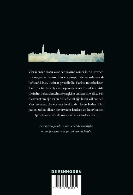 Deze dikke tienerroman leest als een trein. Vier mensen staan voor een warme zomer in Antwerpen. Elk wegen ze, vanuit hun ervaringen, de waarde van de liefde af. Lisse, die haar grote liefde moet loslaten. Tino, die het huwelijk van zijn ouders ziet mislukken. Ada, die in het bejaardentehuis terugkijkt op haar huwelijk. Seb, die treurt om zijn ex en de liefde uit zijn leven wil bannen. Vier mensen, wier paden elkaar onverwacht kruisen en beïnvloeden …