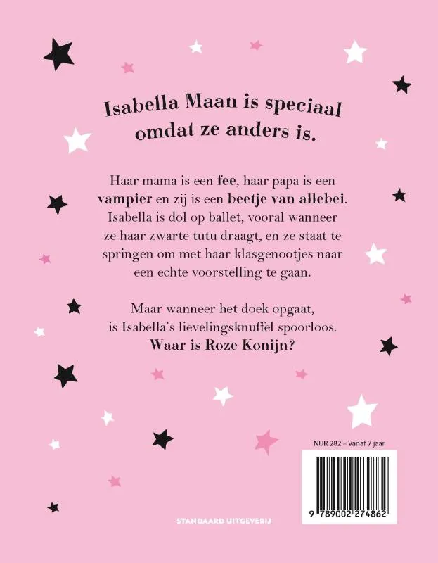 Haar mama is een fee, haar papa is een vampier en zij is een beetje van allebei. Isabella is dol op ballet, vooral wanneer ze haar zwarte tutu draagt, en ze staat te springen om met haar klasgenootjes naar een echte voorstelling te gaan.Maar wanneer het doek opgaat, is Isabella’s lievelingsknuffel spoorloos.Waar is Roze Konijn?