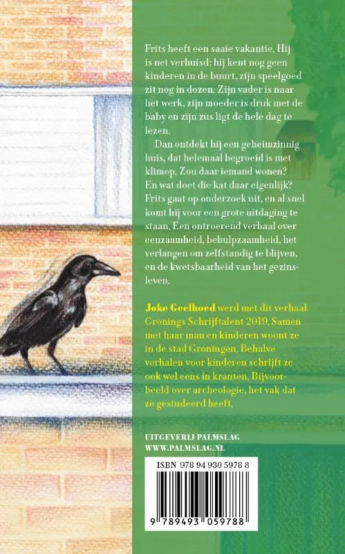 Frits heeft een saaie vakantie. Hij is net verhuisd; hij kent nog geen kinderen in de buurt, zijn speelgoed zit nog in dozen. Zijn vader is naar het werk, zijn moeder is druk met de baby en zijn zus ligt de hele dag te lezen. Dan ontdekt hij een geheimzinnig huis, dat helemaal begroeid is met klimop. Zou daar iemand wonen? En wat doet die kat daar eigenlijk? Frits gaat op onderzoek uit, en al snel komt hij voor een grote uitdaging te staan.