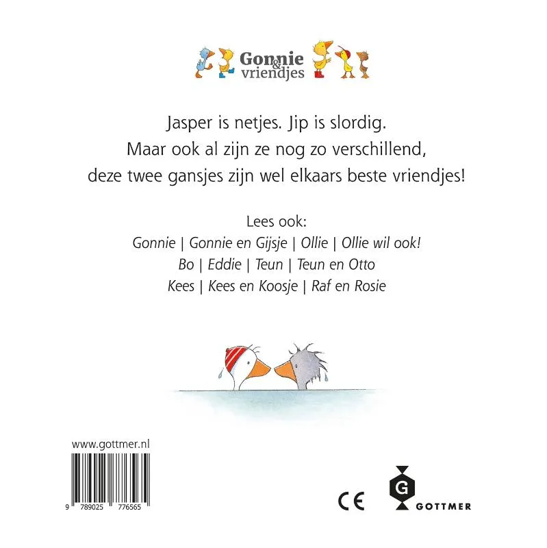 Jasper en Jip zijn vriendjes van Gonnie en Gijsje. In dit kartonboekje in de populaire serie voor peuters van Oliver Dunrea leer je ze beter kennen. Meer dan Jasper en Jip kunnen twee gansjes niet van elkaar verschillen. Zo houdt Jasper van schoon en netjes, en Jip van vies en rommelig. Toch zijn ze de beste vriendjes, want als het moet neemt Jasper een duik in de modder voor Jip.
