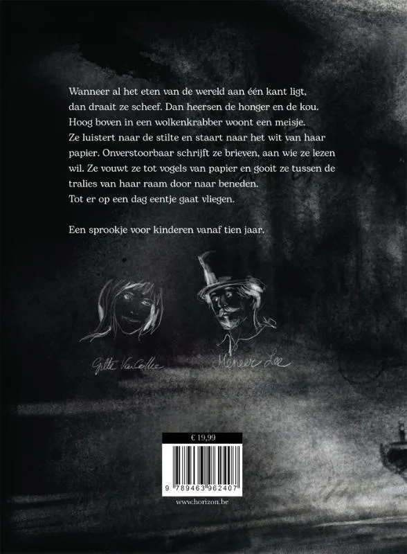 Wanneer al het eten van de wereld aan één kant ligt, dan draait ze scheef. Dan heerst de honger en de kou.<br>Hoog boven in een wolkenkrabber, luistert een meisje naar de stilte en kijkt ze naar het wit van haar papier. Ze schrijft brieven aan wie ze lezen wil. Ze vouwt ze tot vogels van papier en gooit ze tussen de tralies van haar raam door naar beneden. Tot er eentje wegvliegt.
