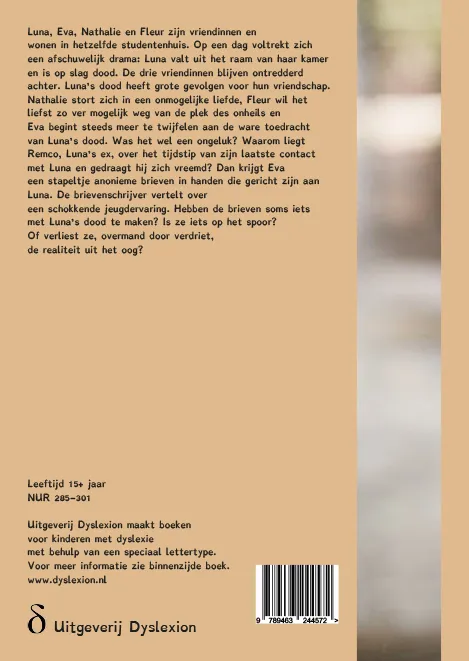 Luna, Eva, Nathalie en Fleur zijn vriendinnen en wonen in hetzelfde studentenhuis. Op een dag voltrekt zich een afschuwelijk drama: Luna valt uit het raam van haar kamer en is op slag dood. De drie vriendinnen blijven ontredderd achter. Luna’s dood heeft grote gevolgen voor hun vriendschap. Nathalie stort zich in een onmogelijke liefde, Fleur wil het liefst zo ver mogelijk weg van de plek des onheils en Eva begint steeds meer te twijfelen aan de ware toedracht van Luna’s dood. Was het wel een ongeluk? Waarom liegt Remco, Luna’s ex, over het tijdstip van zijn laatste contact met Luna en gedraagt hij zich vreemd? Dan krijgt Eva een stapeltje anonieme brieven in handen die gericht zijn aan Luna. De brievenschrijver vertelt over een schokkende jeugdervaring. Hebben de brieven soms iets met Luna’s dood te maken? Is ze iets op het spoor? Of verliest ze, overmand door verdriet, de realiteit uit het oog?