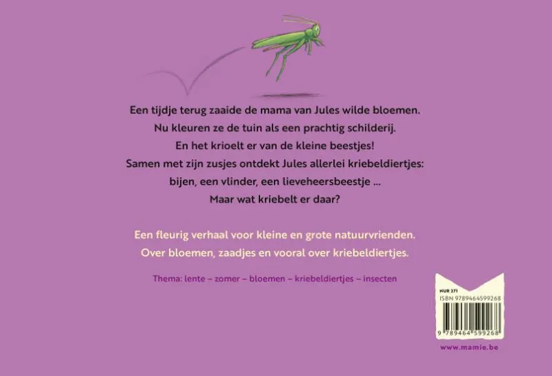 Een tijdje terug zaaide de mama van Jules wilde bloemen.<br>Nu kleuren ze de tuin als een prachtig schilderij.<br>En het krioelt er van de kleine beestjes!<br>Samen met zijn zusjes ontdekt Jules er allerlei kriebeldiertjes:<br>bijen, een vlinder, een lieveheersbeestje …<br>Maar wat kriebelt er daar?