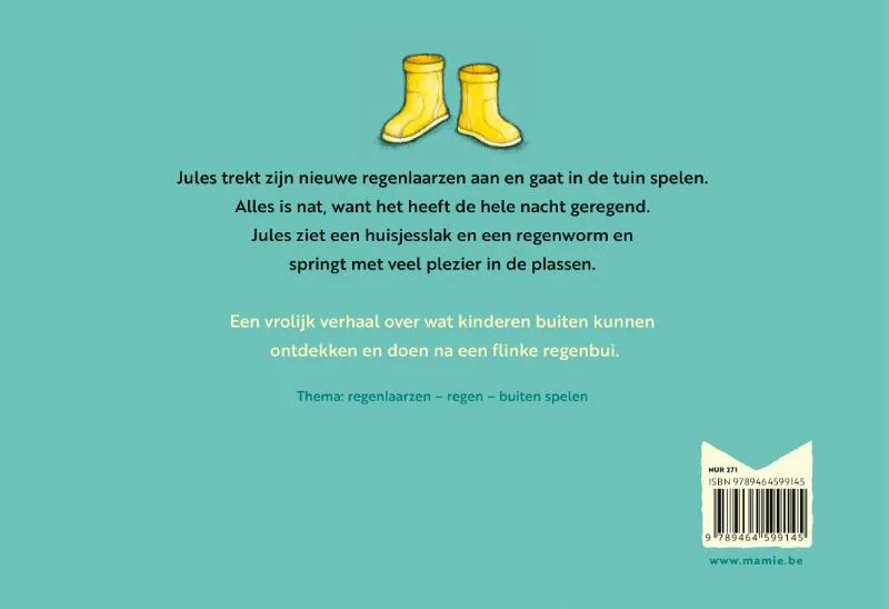 Jules ziet een huisjesslak en een regenworm en springt met veel plezier in de plassen.