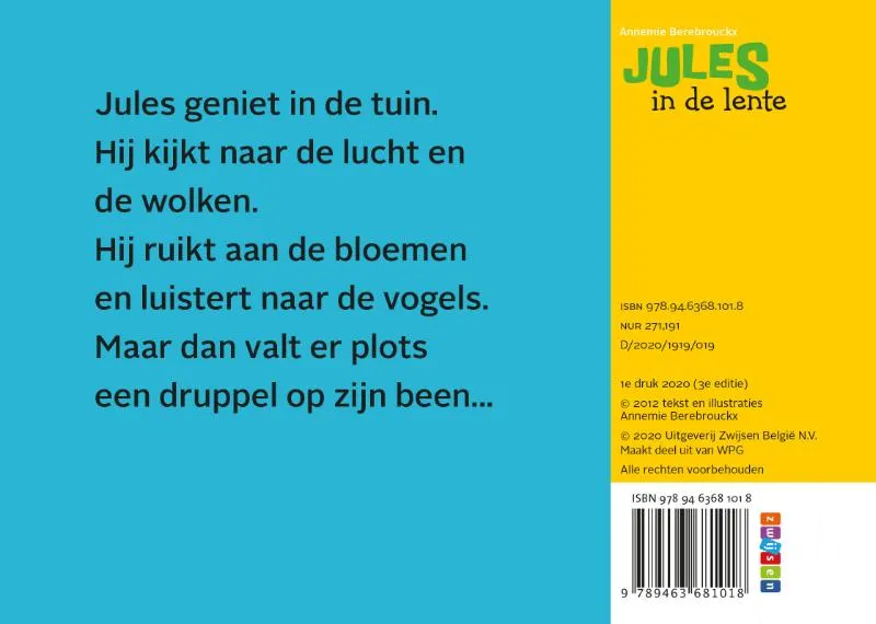 Jules geniet in de tuin. Hij kijkt naar de lucht en de wolken. Hij ruikt aan de bloemen en luistert naar de vogels. Maar dan valt er plots een druppel op zijn been …