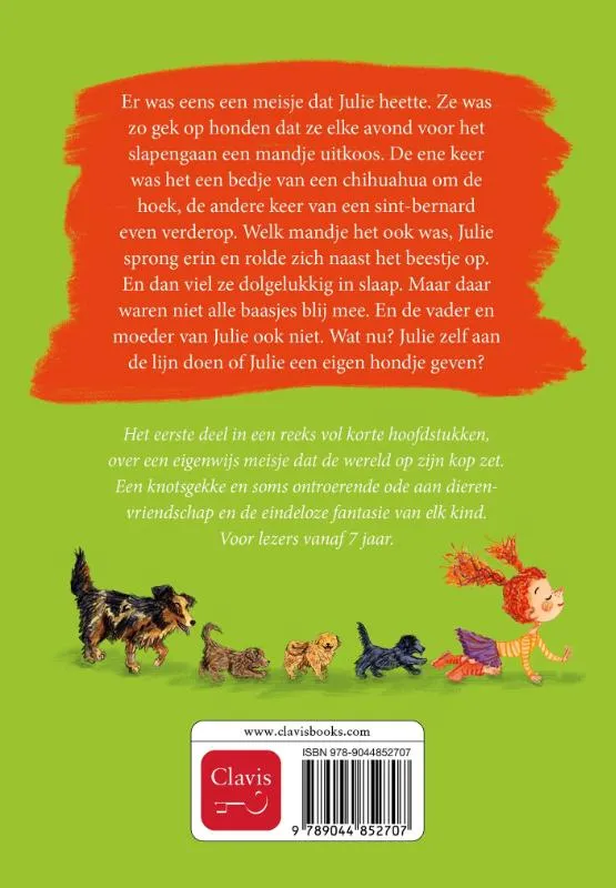 Er was eens een meisje dat Julie heette. Ze was zo gek op honden dat ze elke avond voor het slapengaan een mandje uitkoos. De ene keer was het een bedje van een chihuahua om de hoek, de andere keer van een sint-bernard even verderop. Welk mandje het ook was, Julie sprong erin en rolde zich naast het beestje op. En dan viel ze dolgelukkig in slaap. Maar daar waren niet alle baasjes blij mee. En de vader en moeder van Julie ook niet. Wat nu? Julie zelf aan de lijn doen of Julie een eigen hondje geven?