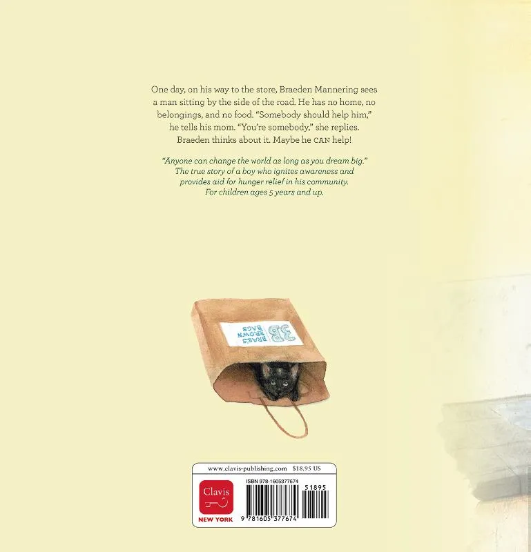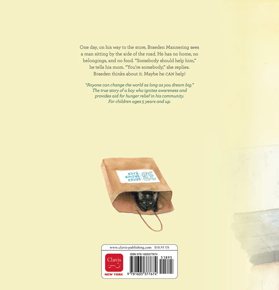 Als de 9-jarige Braeden op een dag een man langs de weg ziet zitten die geen eten, geen spullen en geen huis heeft, bedenkt hij een plan om hem te helpen. Gebaseerd op een waargebeurd verhaal. Prentenboek met gekleurde illustraties. Vanaf 5 jaar.