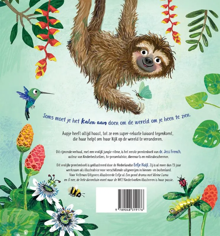 Soms moet je het kalm aan doen om de wereld om je heen te zien. Aapje heeft altijd haast, tot ze een superrelaxte luiaard tegenkomt, die haar helpt om haar kijk op de wereld te veranderen. Kalm aan AAPJE is een rijmend verhaal, met een vrolijk jungle-ritme, is het eerste prentenboek van dr. Jess French, auteur van kinderbestsellers, tv-presentatrice, dierenarts en milieubeschermer.
