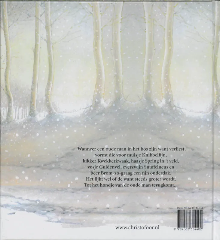 Wanneer een oude man in het bos zijn want verliest, vormt die voor muisje knibbelfijn, kikker Kwekkerkwaak, haasje Spring in ’t veld, vosje Guldenvel, everzwijn Snuffelneus en beer Brom-zo-graag een fijn onderdak. Het lijkt wel of de want steeds groter wordt. Tot het hondje van de oude man terugkomt . Bekroond met de pluim van de maand.