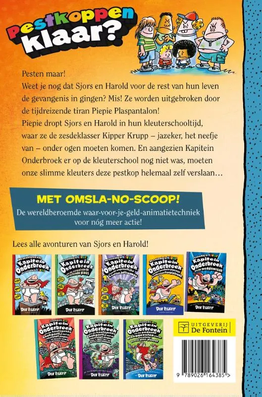 Kapitein Onderbroek en de krankzinnige komst van Piepie Plaspantalon is het negende deel in de supergrappige graphicnovelserie van Dav Pilkey. Volledig in kleur, voor kinderen vanaf 8 jaar. Bekend van de succesvolle Netflix-serie en film.<br><br>Weet je nog dat Sjors en Harold voor de rest van hun leven de gevangenis in gingen? Mis! Ze worden uitgebroken door de tijdreizende tiran Piepie Plaspantalon!<br>Piepie dropt Sjors en Harold in hun kleuterschooltijd, waar ze de zesdeklasser Kipper Krupp – jazeker, het neefje van – onder ogen moeten komen. En aangezien Kapitein Onderbroek er op de kleuterschool nog niet was, moeten onze slimme kleuters deze pestkop helemaal zelf verslaan…