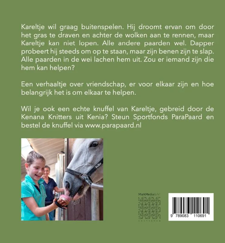Kareltje wil graag buitenspelen. Hij droomt ervan om door het gras te draven en achter de wolken aan te rennen, maar Kareltje kan niet lopen. Alle andere paarden wel. Dapper probeert hij steeds om op te staan, maar zijn benen zijn te slap. Alle paarden in de wei lachen hem uit. Zou er iemand zijn die hem kan helpen?