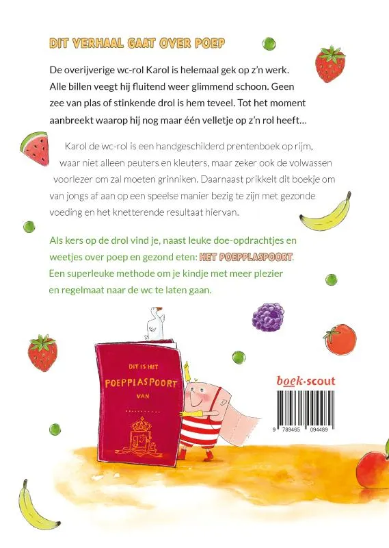 Karol de wc-rol is een grappig en handgeschilderd prentenboek over poep en gezond eten. Als kers op de drol maken de speelse opdrachten, weetjes en het PoepPlaspoort zindelijk worden tot een feestje!