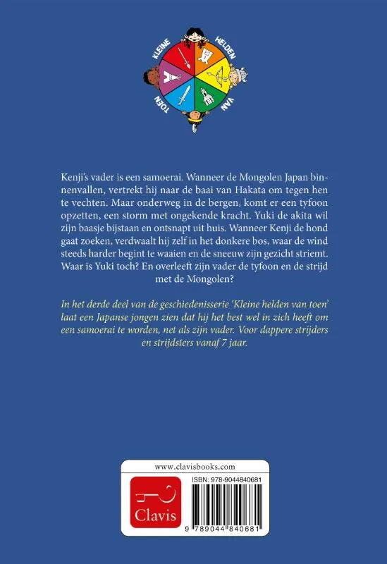 In dit spannende deel uit de geschiedenisserie ‘Kleine helden van toen’ laat een Japanse jongen zien dat hij het best wel in zich heeft om een samoerai te worden, net als zijn vader. Voor dappere strijders en strijdsters vanaf 7 jaar. Kenji’s vader is een samoerai. Wanneer de Mongolen het land binnenvallen, vertrekt hij naar de baai van Hakata om tegen hen te vechten. Maar als hij in de bergen is, komt er een tyfoon opzetten, een storm met ongekende kracht. Yuki de akita wil zijn baasje bijstaan, en ontsnapt uit huis. Kenji gaat de hond gaat zoeken, maar hij verdwaalt in het donkere bos, waar de wind steeds harder begint te waaien en de sneeuw zijn gezicht striemt. Waar is Yuki toch? En overleeft zijn vader de tyfoon en de strijd met de Mongolen?