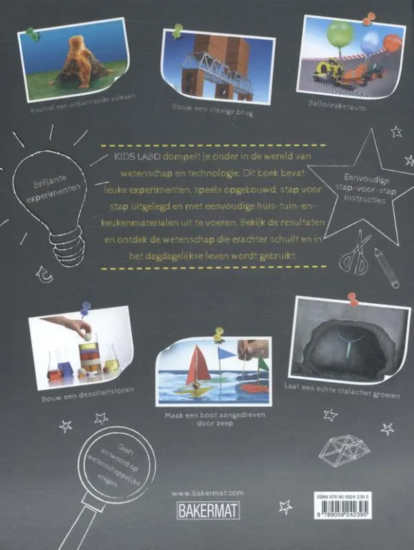 Kids Labo dompelt je onder in de wereld van wetenschap en technologie. Dit boek bevat leuke experimenten, speels opgebouwd, stap voor stap uitgelegd en met eenvoudige huis-tuin-en keukenmaterialen uit te voeren. Bekijk de resultaten en ontdek de wetenschap die erachter schuilt en in het dagdagelijkse leven wordt gebruikt. Thema’s: techniek en wetenschap Onmisbaar in de knutsel- en crealessen Uitvoerbaar met huis-tuin en keukenmaterialen