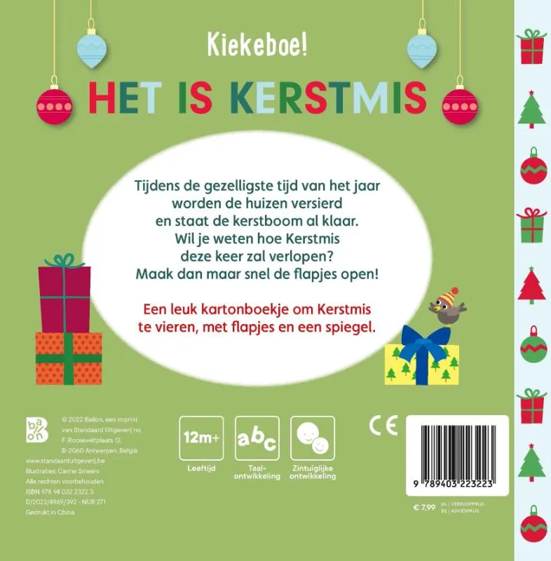 In december komt de kerstman met zijn slee vol cadeautjes. Dit stevige prentenboek met flapjes en spiegeltje leert kinderen over kerstmis. Vanaf ca. 2 jaar.