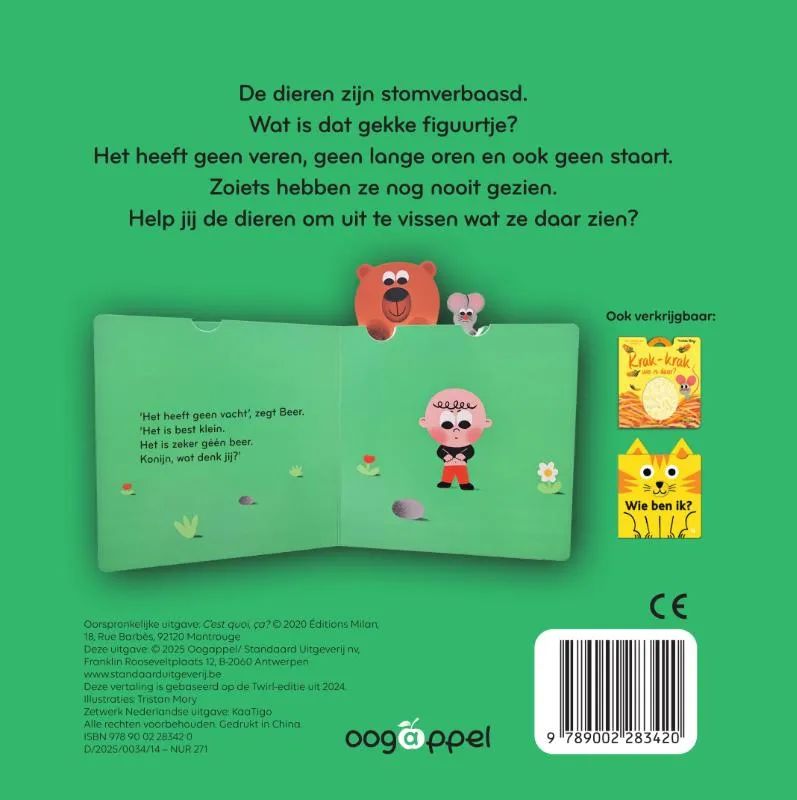 De dieren zijn stomverbaasd.Wat is dat gekke figuurtje?Het heeft geen veren, geen lange oren en ook geen staart.Zoiets hebben ze nog nooit gezien.Help jij de dieren om uit te vissen wat ze daar zien?