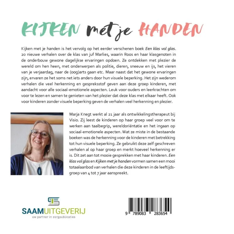 Kijken met je handen is het vervolg op het eerder verschenen boek Een klas vol glas. 20 nieuwe verhalen over de klas van juf Marlies, waarin Roos en haar klasgenoten in de onderbouw gewone dagelijkse ervaringen opdoen. Ze ontdekken met plezier de wereld om hen heen, met onderwerpen als politie, dieren, sneeuw en ijs, het vieren van je verjaardag, naar de (oog)arts gaan etc. Maar naast dat het gewone ervaringen zijn, ervaren ze het soms net iets anders door hun visuele beperking. Het zijn wederom verhalen die veel herkenning en gespreksstof geven aan deze groep kinderen, met aandacht voor alle sociaal-emotionele aspecten. Leuk voor ouders en leerkrachten om voor te lezen en samen te genieten van het plezier dat deze klas met elkaar heeft. Ook voor kinderen zonder visuele beperking geven de verhalen veel herkenning en plezier.