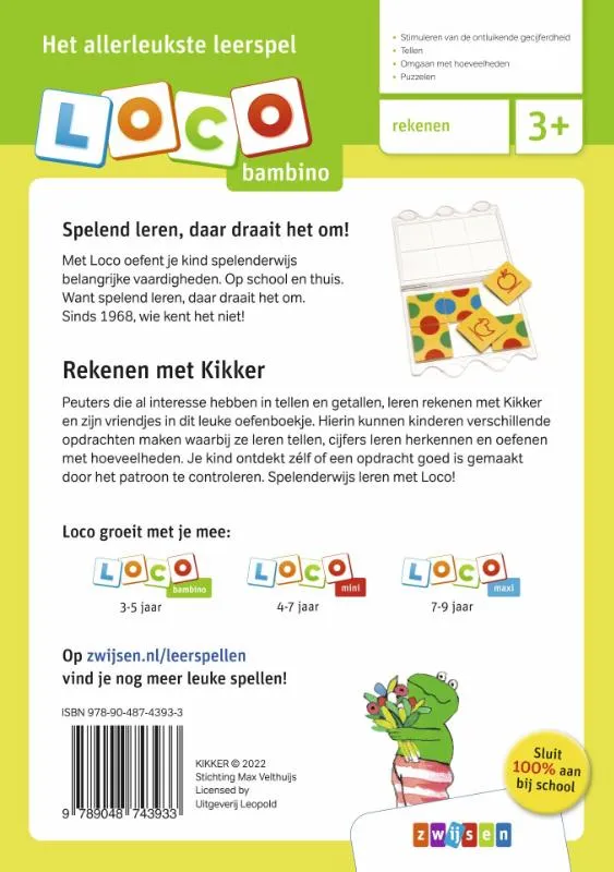 Spelenderwijs leren rekenen met Loco Kikker. Tellen, hoeveelheden vergelijken en kennismaken met cijfers. Met de mooie illustraties van Max Velthuijs.