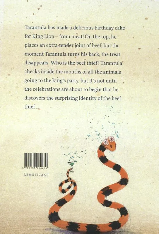 Alle dieren maken iets lekkers voor de jarige Koning Leeuw. Vogelspin heeft een prachtige vleestaart gemaakt, maar iemand heeft er stiekem van gesnoept. Wie is de dief? Humoristisch prentenboek met kleurrijke aquarellen. Vanaf ca. 4 jaar.