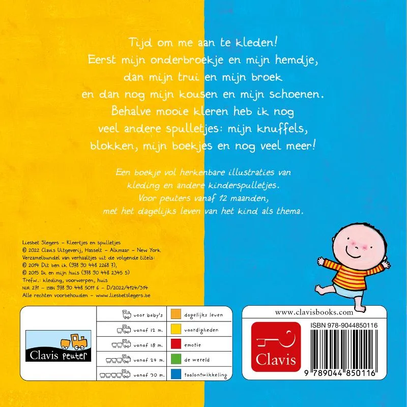 Tijd om me aan te kleden! Eerst mijn onderbroekje en mijn hemdje, dan mijn trui en mijn broek en dan nog mijn kousen en mijn schoenen. Behalve mooie kleren heb ik nog veel andere spulletjes: mijn knuffels, blokken, mijn boekjes en nog veel meer! Een boekje vol herkenbare illustraties van kleding en andere kinderspulletjes. Kleertjes en spulletjes voor peuters vanaf 12 maanden, met het dagelijks leven van het kind als thema.