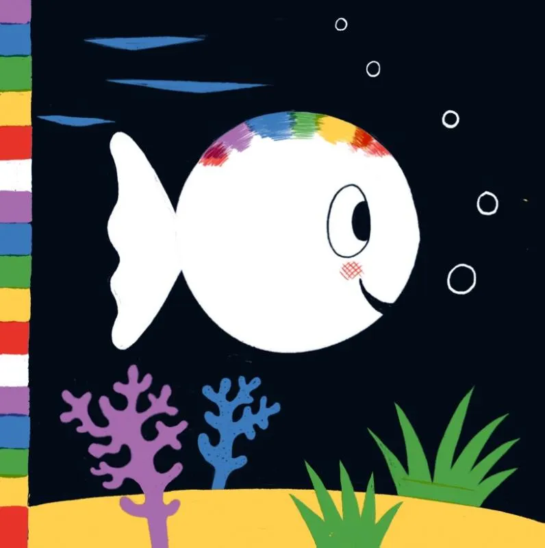 Een stoffen boekje met vrolijke tekeningen, heldere kleuren en heerlijke knisperende pagina’s.