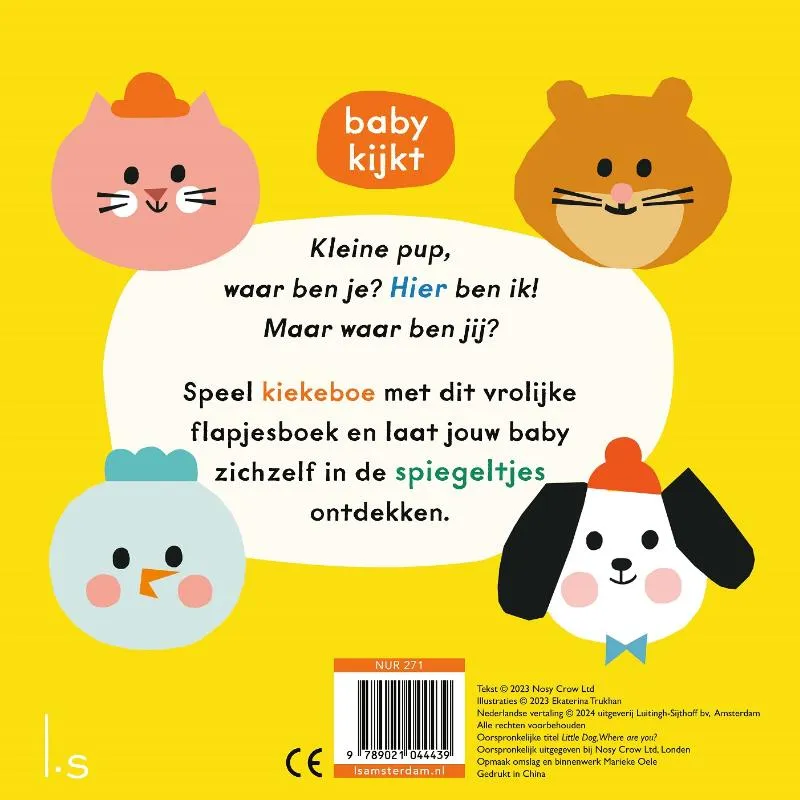 Baby’s zijn dol op spiegels. En de boeken van de Baby kijkt-serie hebben op elke spread een spiegel, achter een stevige kartonnen flap die babyhandjes makkelijk kunnen omslaan. Zo leren baby’s keer op keer hun eigen gezicht herkennen. En met de lieve dierengezichtjes en vrolijke kleuren wordt het (voor)lezen van dit boek één groot feest!