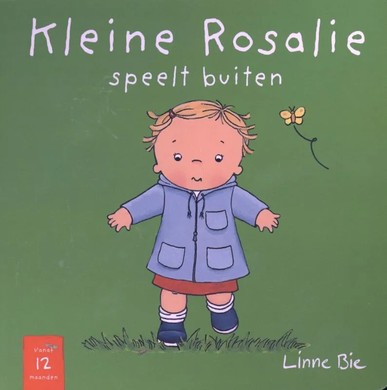 Kleine Rosalie speelt in de tuin in het gras, voert de vogel, plukt bloemen en ontdekt allerlei kleine beestjes. Vierkant hardkartonnen prentenboekje met eenvoudige tekeningen in zachte kleuren. Vanaf ca. 1,5 jaar.
