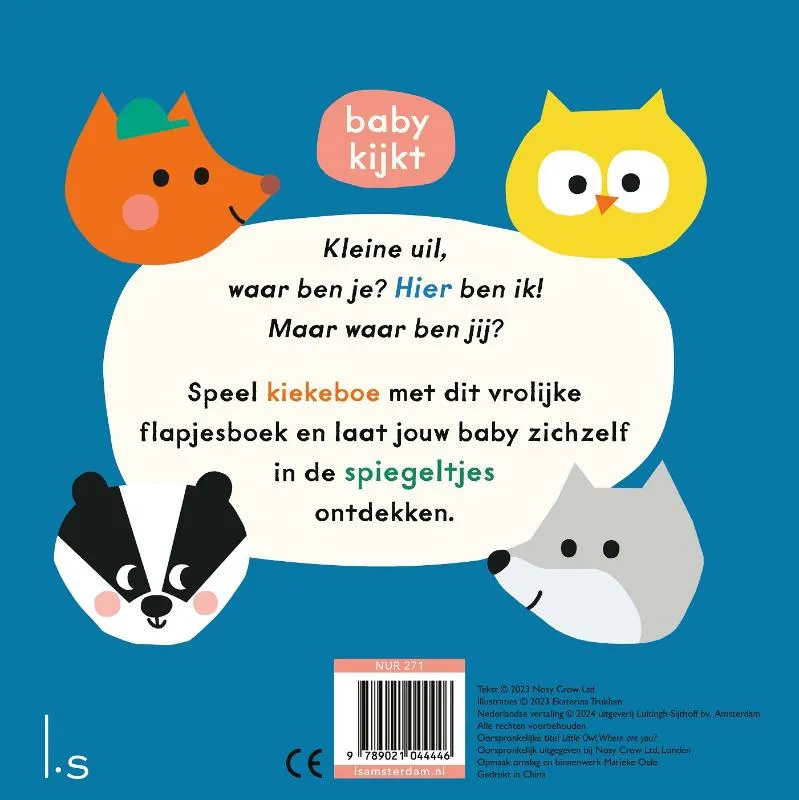 Speel kiekeboe met Baby kijkt – Kleine uil, waar ben je?, een flapjesboek vol dierengezichten van illustrator Ekaterina Trukhan. Laat jouw baby zichzelf in de spiegeltjes ontdekken.