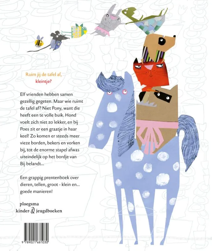Elf vrienden hebben samen gezellig gegeten. Maar wie ruimt de tafel af? Niet Pony, want die heeft een te volle buik. Hond voelt zich niet zo lekker, en bij Poes zit er een graatje in haar keel! Zo komen er steeds meer vieze borden, bekers en vorken bij, tot de enorme stapel afwas uiteindelijk op het bordje van Bij belandt…