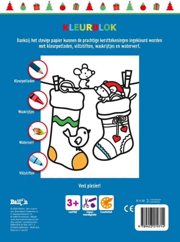 Dankzij het stevige papier kunnen de prachtige kersttekeningen ingekleurd worden met kleurpotloden, viltstiften, waskrijtjes en waterverf. De tekening zijn aangepast aan kinderen vanaf 2 jaar.