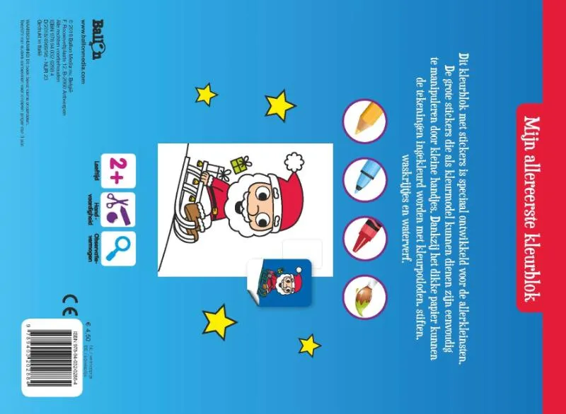 Dit kleurblok met stickers is speciaal ontwikkeld voor de allerkleinsten. De grote stickers die als kleurmodel kunnen dienen zijn eenvoudig te manipuleren door kleine handjes. Dankzij het dikke papier kunnen de tekeningen ingekleurd worden met kleurpotloden, stiften, waskrijtjes en waterverf.