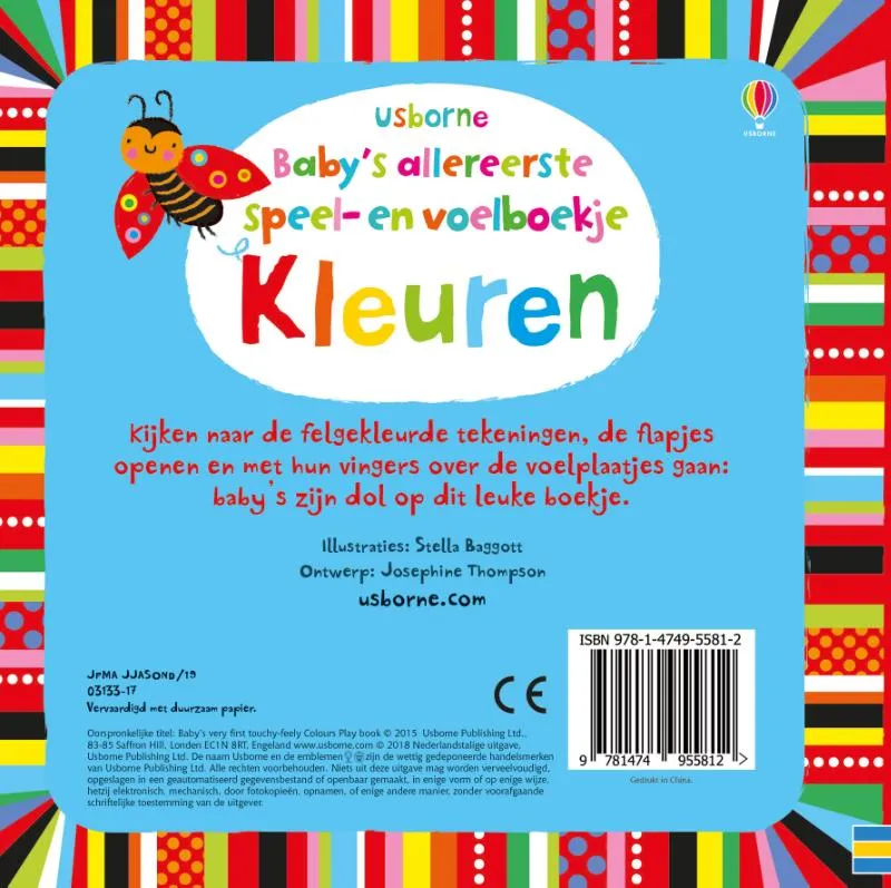 Baby’s doen de flapjes open, gaan met hun vingers over de voelplaatjes en leren al spelend de kleuren. Elke bladzijde is speciaal ontworpen om baby’s visueel te stimuleren met de felgekleurde, opvallende tekeningen met een heleboel details. Een leuk hulpmiddel om talige en sensorische vaardigheden bij jonge kinderen te ontwikkelen, met uitgestanste voelsporen en kijkgaatjes.