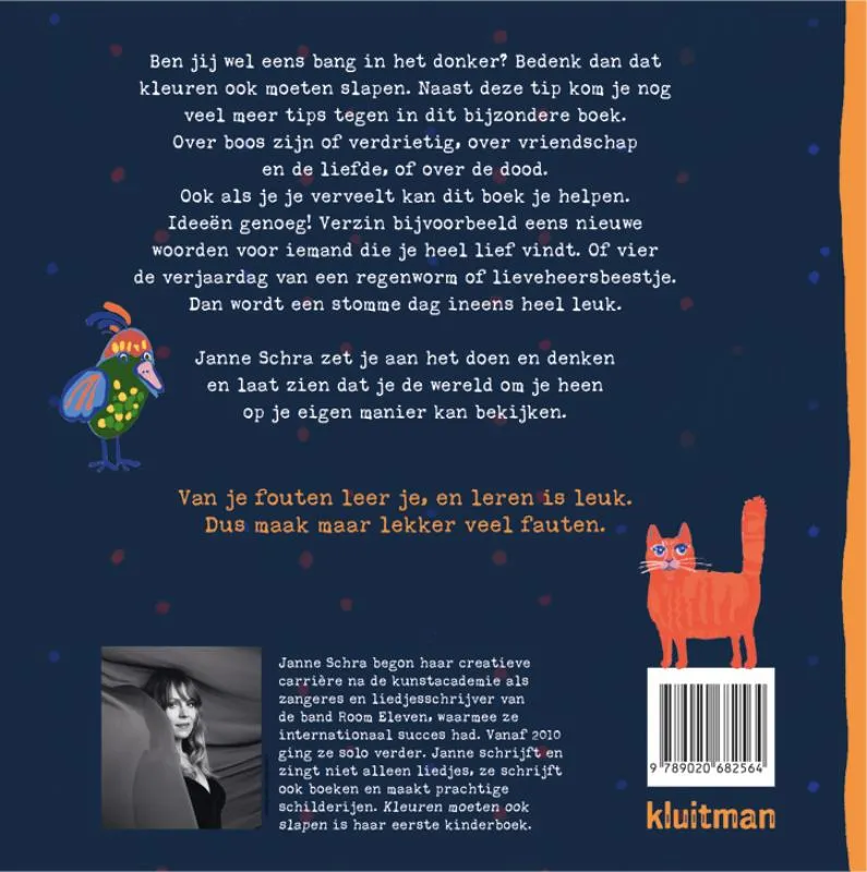 Ben jij wel eens bang in het donker? Bedenk dan dat kleuren ook moeten slapen. Naast deze tip kom je nog veel meer tips tegen in dit bijzondere boek. Over boos zijn of verdrietig, over vriendschap en de liefde, of over de dood. Ook als je je verveelt kan dit boek je helpen. Ideeën genoeg! Verzin bijvoorbeeld eens nieuwe woorden voor iemand die je heel lief vindt. Of vier de verjaardag van een regenworm of lieveheersbeestje. Dan wordt een stomme dag ineens heel leuk. Janne Schra zet je aan het doen en denken en laat zien dat je de wereld om je heen op je eigen manier kan bekijken.Van je fouten leer je, en leren is leuk. Dus maak maar lekker veel fauten.