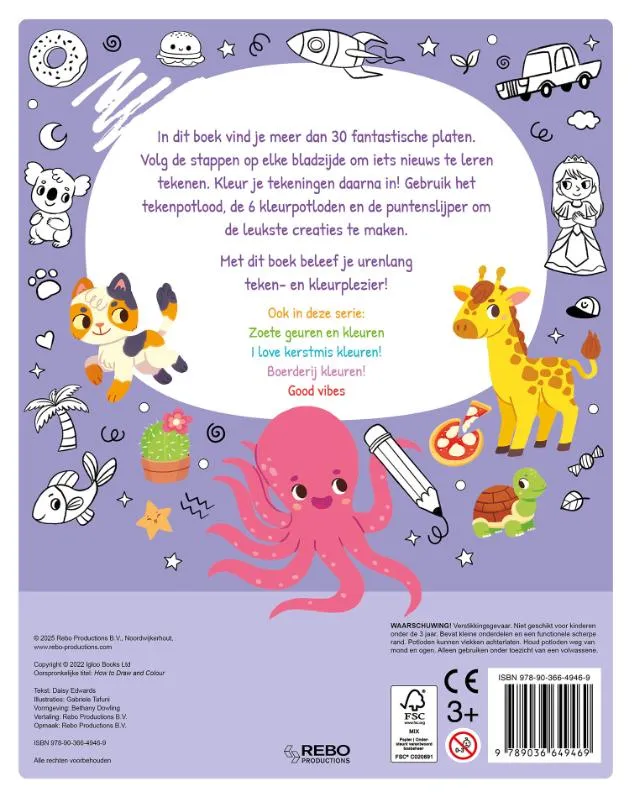 In dit boek vind je meer dan 30 fantastische platen. Volg de stappen op elke bladzijde om iets nieuws te lerentekenen. Kleur je tekeningen daarna in! Gebruik het tekenpotlood, de 6 kleurpotloden en de puntenslijper om de leukste creaties te maken. Met dit boek beleef je urenlang teken- en kleurplezier!