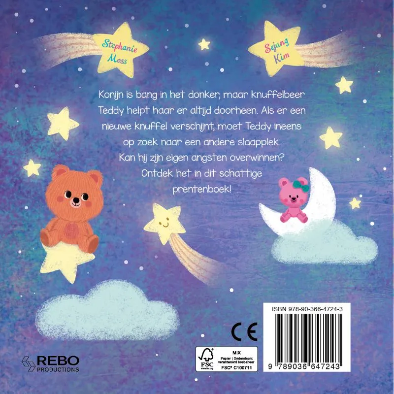 Konijn is bang in het donker, maar knuffelbeer Teddy helpt haar er altijd doorheen. Als er een nieuwe knuffel verschijnt, moet Teddy ineens op zoek naar een andere slaapplek. Kan hij zijn eigen angsten overwinnen? Ontdek het in dit schattige prentenboek!
