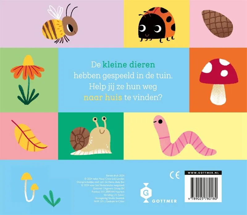 Help vier babydieren de weg naar huis te vinden in het peuterboek ‘Kom je thuis, kleine bij?’. Peuters kunnen zelf de paden volgen met behulp van de schuifjes. Zo begeleiden ze de bij, het lieveheersbeestje, de slak en de worm terug naar hun huis.<br>Dit speelse prentenboek stimuleert met de schuifjes de hand-oogcoördinatie en fijne motoriek van dreumesen en peuters. De eerste woordjes en begrippen sluiten aan bij de belevingswereld van jonge kinderen. Door de illustraties aan te wijzen en de woordjes te benoemen, wordt de woordenschat spelenderwijs vergroot. <br>Illustrator en animator Carolina Búzio brengt met meer dan tien jaar ervaring in grafisch ontwerp een unieke sfeer en emotie in haar illustraties. Haar werk, bekend om zijn originaliteit, maakt van dit boek een visueel feestje voor kleine kindjes. De boekjes in de ‘Kom je thuis?’-serie zijn leuk voor kinderen vanaf 18 maanden.