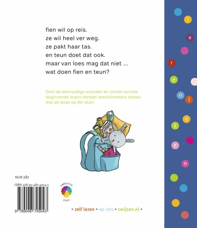 Beginnende lezers lezen al snel zelf dit vrolijke boek door de korte woorden en eenvoudige zinnen. Fien, bekend van Avonturenboerderij Molenwaard, wil op reis en Teun wil mee. Maar dat mag niet. Dan gaan ze maar op reis door de tuin. Lees het hele verhaal in dit leuke boek op AVI Start, dus voor kinderen van 6-7 jaar om zelf te lezen.<br><br>fien wil op reis.<br>ze wil heel ver weg.<br>ze pakt haar tas.<br>en teun wil mee.<br>maar dat mag niet …<br>wat doen fien en teun?