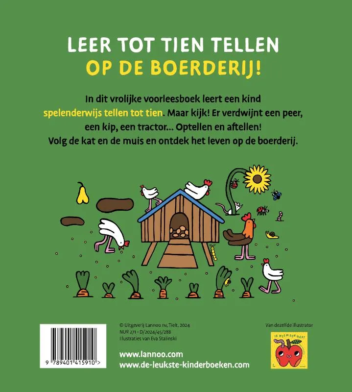 In dit vrolijke voorleesboek leert een kind spelenderwijs tellen tot tien. Maar kijk! Er verdwijnt een peer, een kip, een tractor… optellen en aftellen!