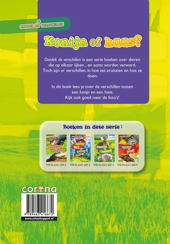 Ontdek de verschillen is een serie boeken over dieren die op elkaar lijken… en soms worden verward. Toch zijn er verschillen: in hoe zet eruitzien en hoe ze doen. In dit boek lees je over de verschillen tussen een konijn en een haas. Kijk ook goed naar de foto’s!