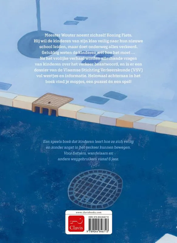Meester Wouter noemt zichzelf Koning Fiets. Hij wil de kinderen van zijn klas veilig naar hun nieuwe school leiden, maar doet onderweg alles verkeerd. Gelukkig weten de kinderen wél hoe het moet … Na het vrolijke verhaal worden allerhande vragen van kinderen over het verkeer beantwoord, en is er een dossier van de Vlaamse Stichting Verkeerskunde (VSV) vol weetjes en informatie. Helemaal achteraan in het boek vind je mopjes, een puzzel én een spel!