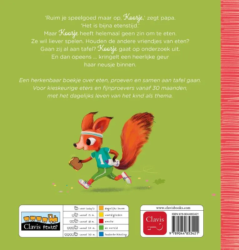 ‘Ruim je speelgoed maar op, Koosje,’ zegt papa.‘Het is bijna etenstijd.’Maar Koosje heeft nog helemaal geen zin om te eten.Ze wil liever spelen. Houden de andere dieren van eten?Gaan zij al aan tafel? Koosje gaat op onderzoek uit. En dan opeens … kringelt een heerlijke geur haar neusje binnen.Een herkenbaar boekje over eten, proeven en samen aan tafel gaan. Voor kieskeurige eters en fijnproevers vanaf 30 maanden, met het dagelijks leven van het kind als thema.